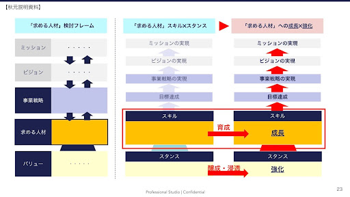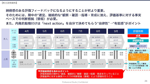秋元からは、「月1回でいいので、評価基準に基づいたGood / More / Next Action の対話を行うこと」が強く提唱されました。実際に評価基準に基づいた行動ができていれば「求める人材像」に近づいていっているわけで、それは事業戦略につながることになります。
