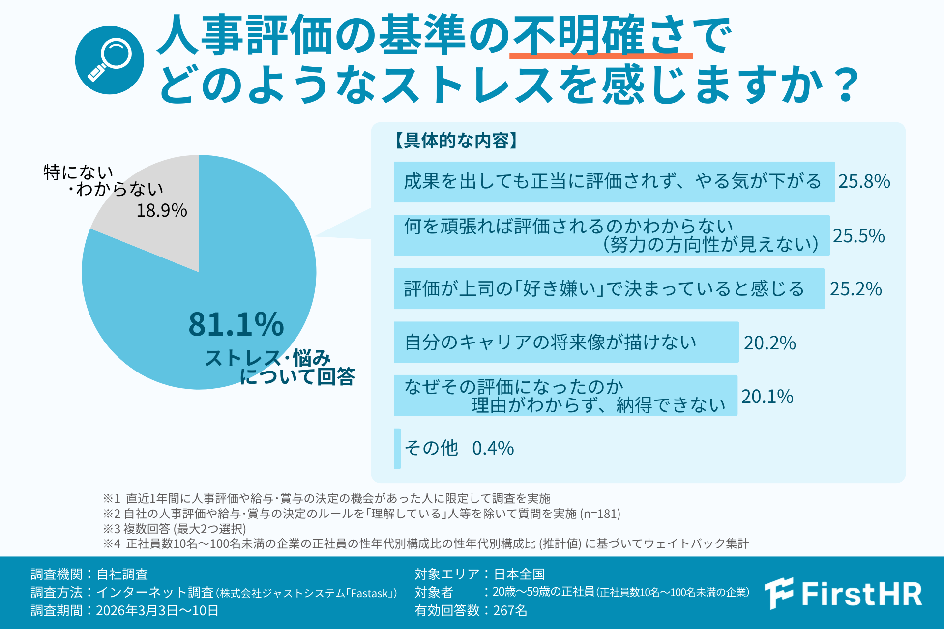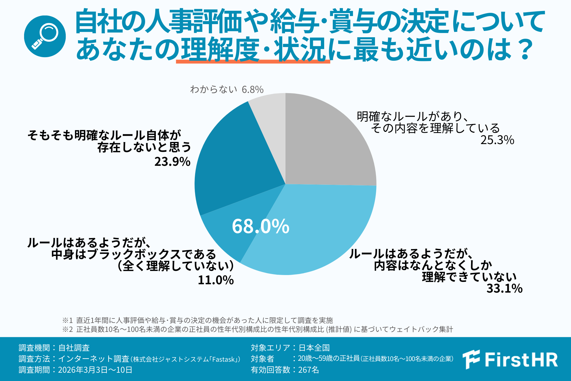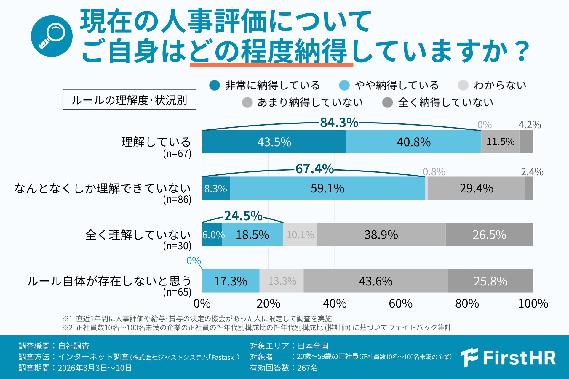FirstHRでは、人事評価制度の運用実態と社員心理への影響を明らかにするため、正社員数10〜100名未満の中小企業に勤務する20〜59歳の正社員267名を対象にアンケート調査を実施しました。