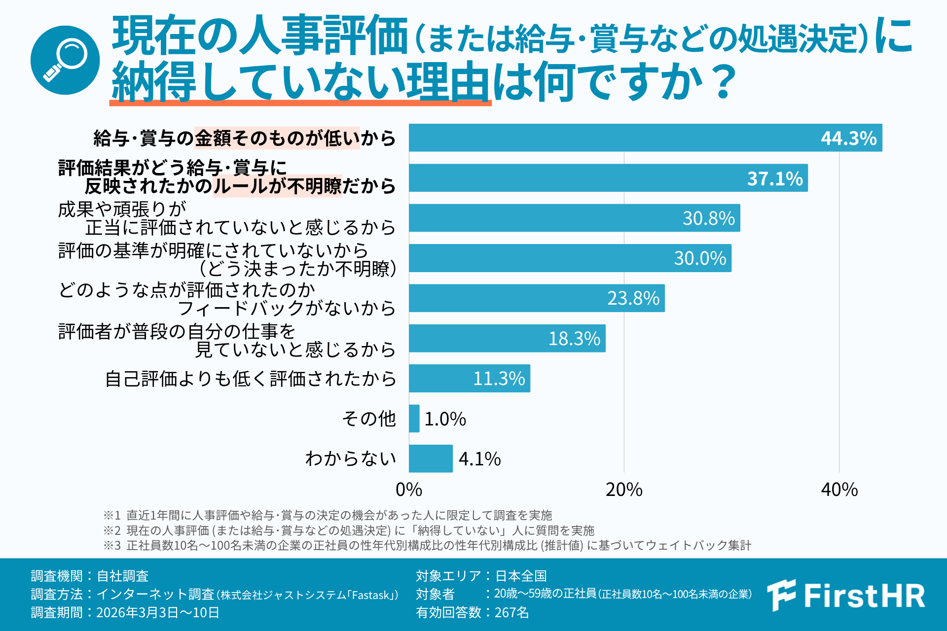 不満の理由として最も多かったのは、「給与・賞与の金額そのものが低いから」で44.3%となりました。次いで、「評価結果がどう給与・賞与に反映されたかのルールが不明瞭だから」が37.1%、「成果や頑張りが正当に評価されていないと感じるから」が30.8%、「評価の基準が明確にされていないから」が30.0%と続いています。