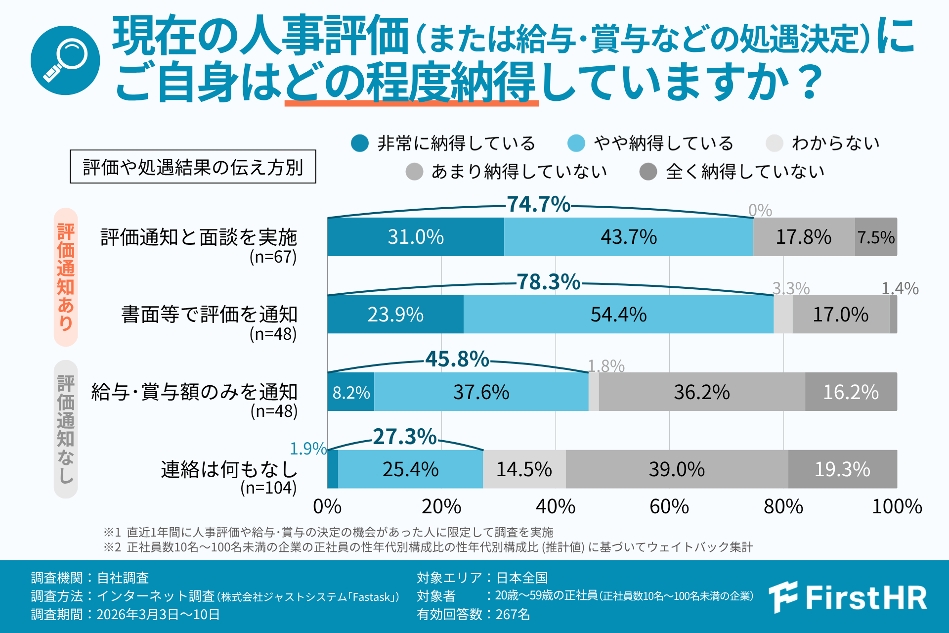納得率は、「書面等で評価を通知」層が78.3%で最多となり、僅差で「評価通知と面談を実施」層が74.7%で続きました。これらの評価結果の通知があった社員の納得率が7割以上を示したのに対し、「給与・賞与額のみを通知」層は45.8%、「連絡は何もなし」層は27.3%と大きく低下しています。