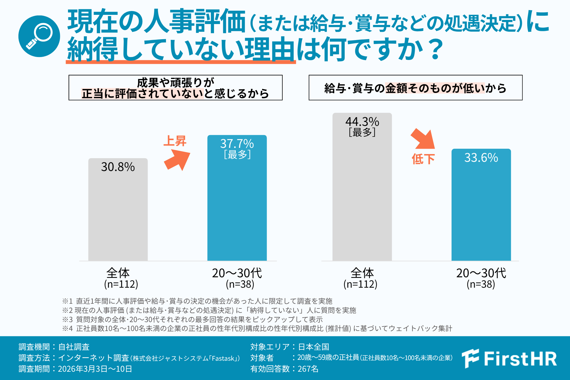 20〜30代では、「成果や頑張りが正当に評価されていないと感じるから」が37.7%となり、全体から6.9ポイント上昇して最多となりました。一方、全体トップの「給与・賞与の金額そのものが低いから」は、10.7ポイントの低下を示しています。若い年代においては、仕事ぶりを丁寧に評価することがより重要になる様子がうかがえます。