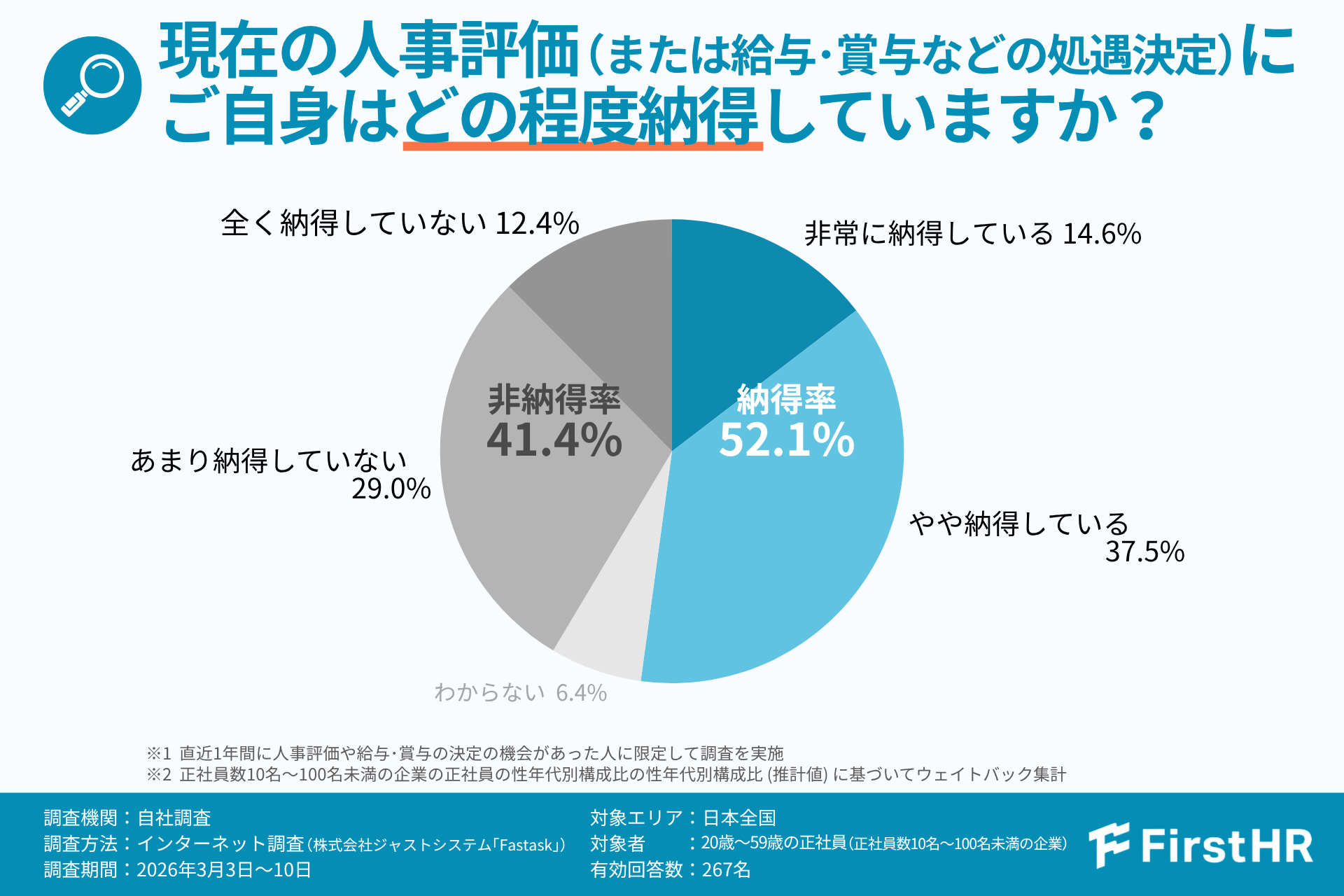 そこで、人事評価への納得感とそれを左右する要因を把握するため、正社員数10名~100名未満の企業に所属する20歳~59歳の正社員267名を対象に調査を実施しました。