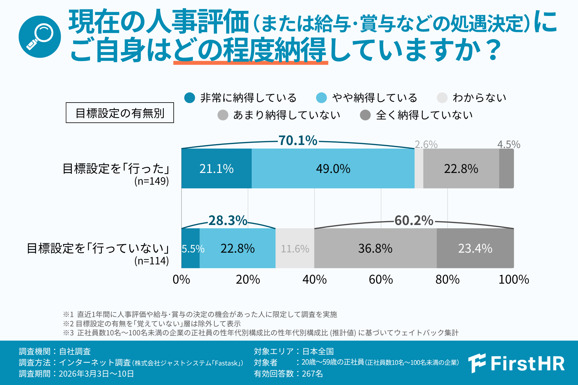 2.目標設定を「行った」層の納得率は70.1%、「行っていない」層は28.3%にとどまる