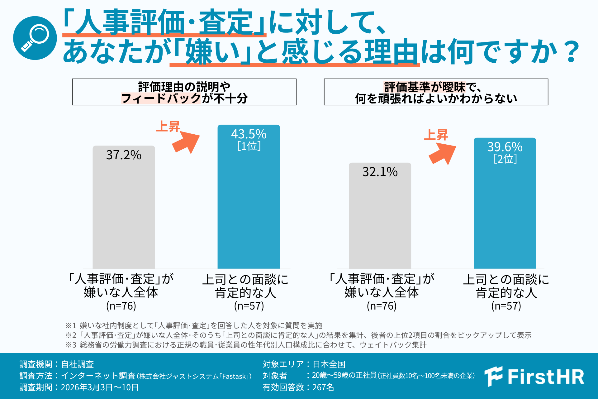 最も多かったのは「評価理由の説明やフィードバックが不十分」で43.5%に上りました。これは、人事評価を嫌う人全体の割合(37.2%)を上回っています。また、「評価基準が曖昧で、何を頑張ればよいかわからない」も39.6%となり、全体(32.1%)と比較して高い割合となっています。