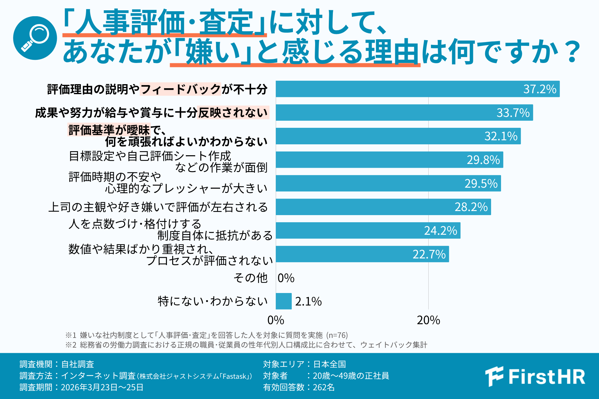 では、具体的に人事評価のどのような点に不満を抱いているのでしょうか。先ほどの質問で「人事評価・査定」が嫌いと回答した人を対象に、その理由について質問しました。